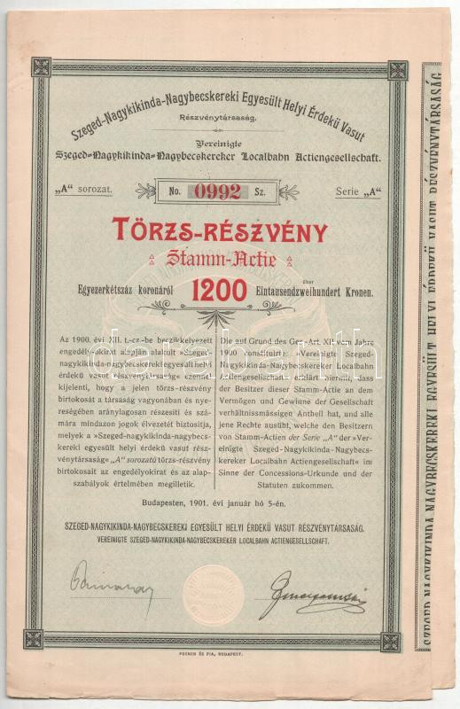 Description: Budapest 1901. "Szeged-Nagykikinda-Nagybecskereki Egyesült Helyi Érdekű Vasut Részvénytársaság" törzsrészvénye 1200K-ról, német és magyar nyelven, szelvényekkel, szárazpecséttel T:AU