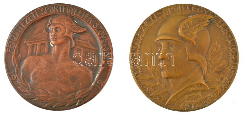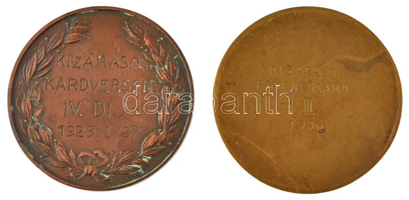 1929. "Pénzintézeti Sportegyletek Szövetsége" bronz díjérem, hátoldalán "Kizárásos kardverseny IV. díj 1929 I/27" gravírozással (36mm) + 1936. "Pénzintézeti Sportegyletek Ligája 1912" bronz díjérem, hátoldalán "Kizárásos egyéni kard III. 1936" gravírozással (36mm) T:AU,XF patina