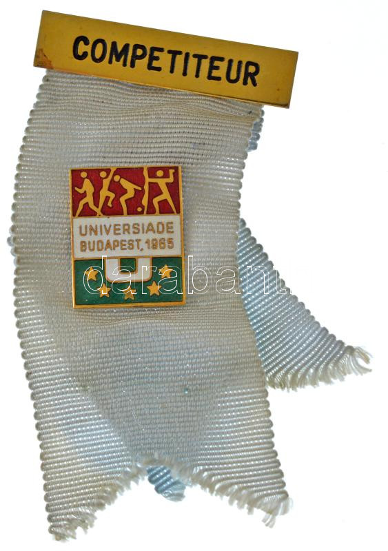 Description: 1965. "Universiade Budapest 1965" a FISU világjátékok aranyozott, zománcozott bronz jelvénye + bronz jelvény "Competiteur" felirattal, mindkettő egy szalagon, résztvevői jelvény T:XF