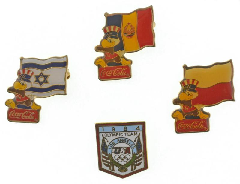 Amerikai Egyesült Államok 1984. "Résztvevő országok - Los Angeles" műgyantás fém olimpiai jelvény (3xklf: Izrael, Lengyelország, Románia) + "Egyesült Államok olimpiai csapata 1984, Los Angeles" zománcozott fém jelvény T:UNC,AU USA 1984. "Participating countries - Los Angeles" resin metal Olympic badges (3xdiff: Israel, Poland, Romania) + "USA Olympic Team 1984, Los Angeles" enamelled metal badge C:UNC,AU