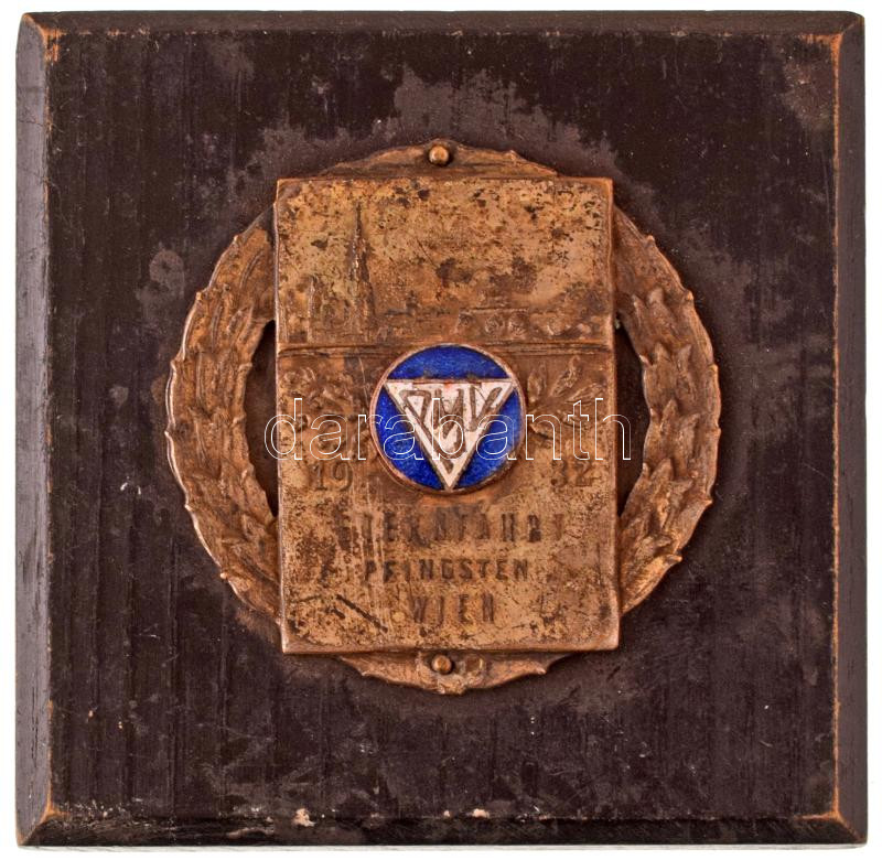 Description: Ausztria 1912. "PMV (Puch Motor Klub) Pünkösdi csillagtúra, Bécs" egyoldalas, részben zománcozott fém lemezjelvény (52x50mm) falapon (79x79mm) T:VF patina, zománchiba Austria 1912. "PMV (Puch Motor Verein) Sternfahrt Pfingsten, Wien (Pentecost Star Tour)" one-sided metal plaque (52x50mm) on wooden plate (79x79mm) C:VF patina, enamel error