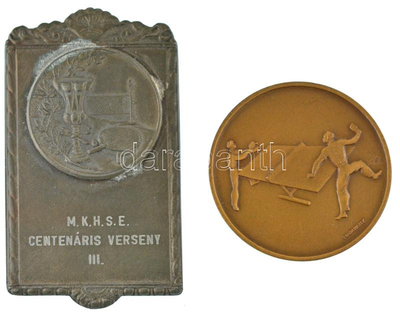 Madarassy Walter (1909-1994) 1950. Bronz asztali tenisz díjérem, hátoldalán "CS.B. 1950. ősz" gravírozással (40mm) + Zn asztali tenisz díjplakett "M.K.H.S.E. Centenáris verseny III" gravírozással (68x39mm) T:AU,XF oxidáció