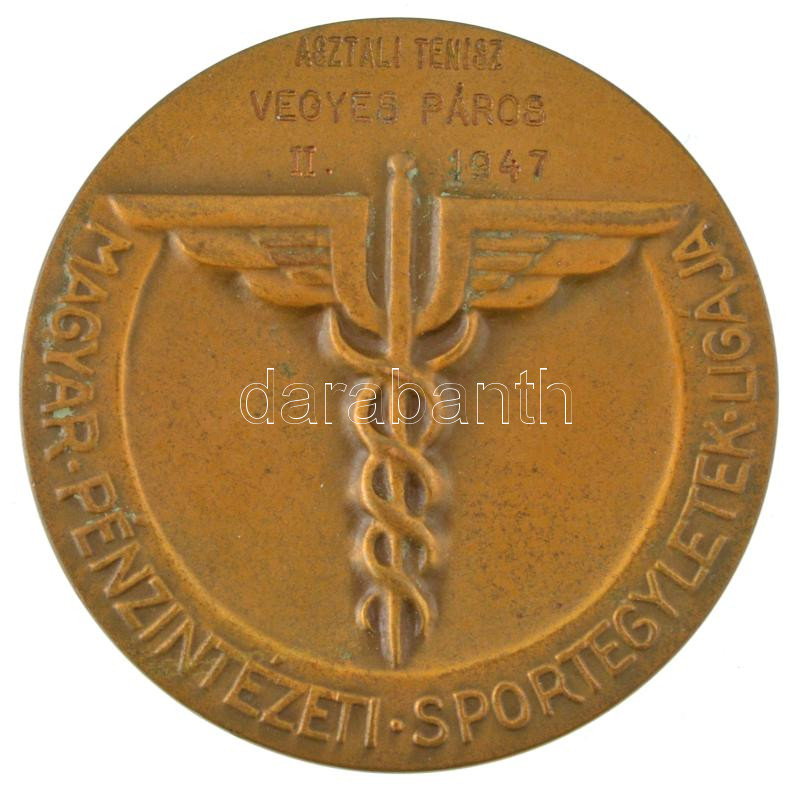 Description: Matskássy Gyula (1912-1971) 1947. "Bajnoki Érem / Magyar Pénzintézeti Sportegyletek Ligája" bronz díjérem, hátoldalán "Asztali tenisz vegyes páros II. 1947" gravírozással (40mm) T:AU