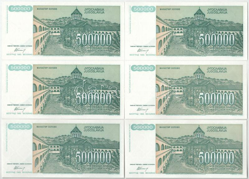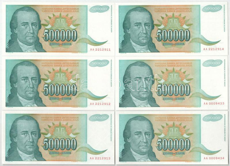 Jugoszlávia 1993. 500.000D (6x) 4+2 sorszámkövető "AA 0009433 - A...