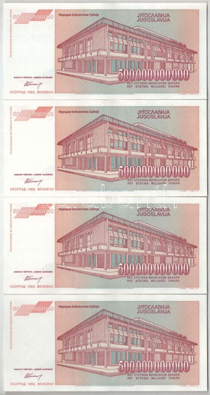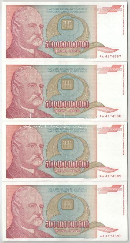 Jugoszlávia 1993. 500.000D (6x) 4+2 sorszámkövető "AA 0009433 - AA 0009434" és "AA 2212911 - AA 2212914" + 1993. 500.000.000.000D (4x) sorszámkövető "AA 4174587 - AA 4174590" T:UNC,AU