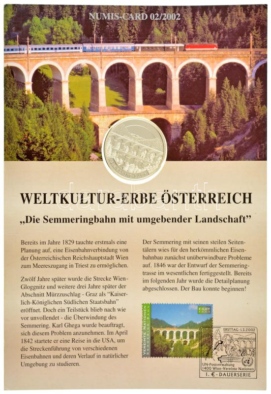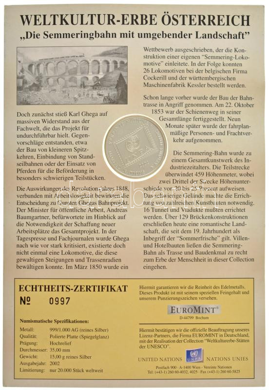 Description: Ausztria 2002. "Semmeringi vasút" kétoldalas Ag emlékérem felbélyegzett karton díszlapon bélyegzéssel (15g/0.999/35mm) T:PP