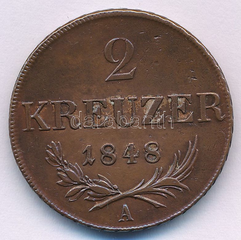 https://www.darabanth.com/en/457-Online-auction/457.0/Numismatics/Worldwide-silver-and-metal-coins~16/Ausztria-1848A-2kr-Cu-TAU-patina--Austria-1848A-2-Kreuzer-Cu-CAU-patina-Krause-KM232188~II3053345