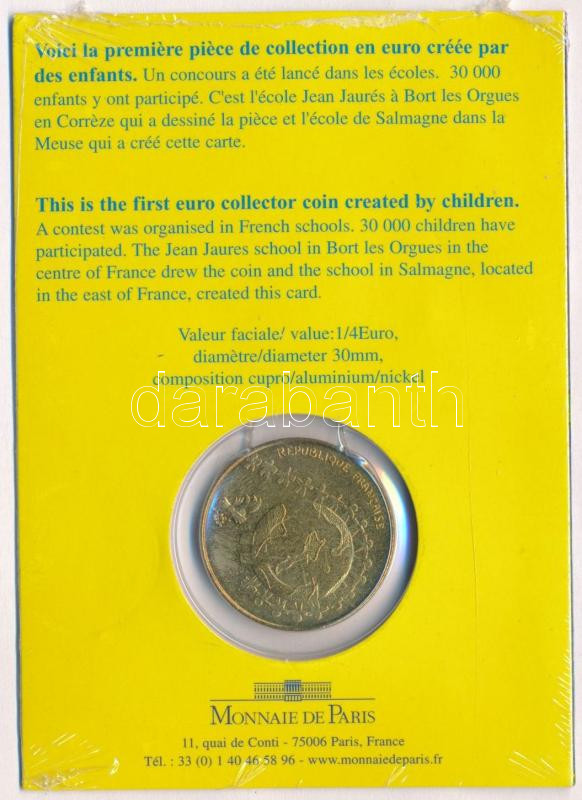 Franciaország 2002. 1/4E "Gyermekek Euro dizájnja" Cu-Al-Ni ... https://www.darabanth.com/en/457-Online-auction/457.0/Numismatics/Worldwide-silver-and-metal-coins~16/Franciaorszag-2002-14E-Gyermekek-Euro-dizajnja-Cu-Al-Ni-diszlapon-TUNC-France-2002-14-Eur~II3033639