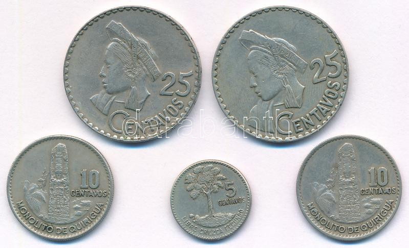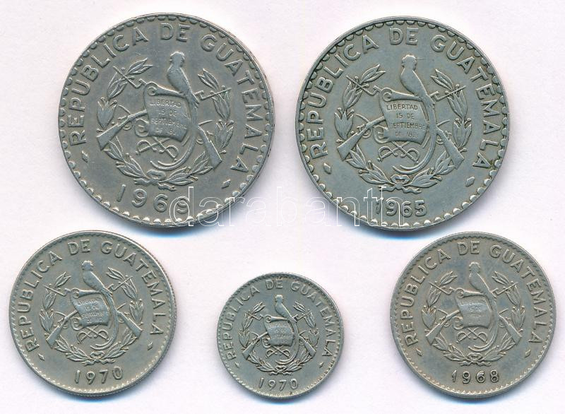 Guatemala 1965. 25c Ni-sárgaréz + 1968. 10c Cu-Ni-Zn + 1969. 25c Cu-Ni-Zn + 1970. 5c Cu-Ni-Zn + 10c Cu-Ni-Zn T:XF,VF