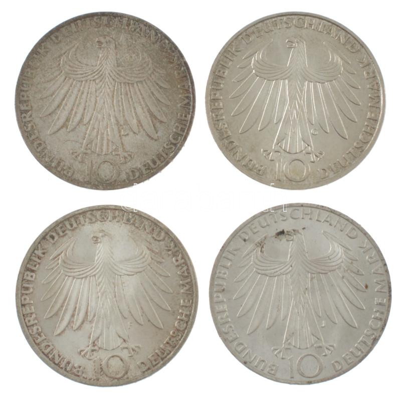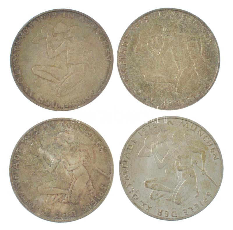 NSZK 1972D,F,J,G 10M Ag "Müncheni Olimpia - térdelő atléták" (4xklf), eredeti "XX. Olympische Spiele München - Kiel 1972" dísztokban T:AU patina FRG 1972D,F,J,G 10 Mark Ag "Munich Olympics - Athletes kneeling" (4xdiff), in original "XX. Olympische Spiele München - Kiel 1972" case C:AU patina Krause KM#132