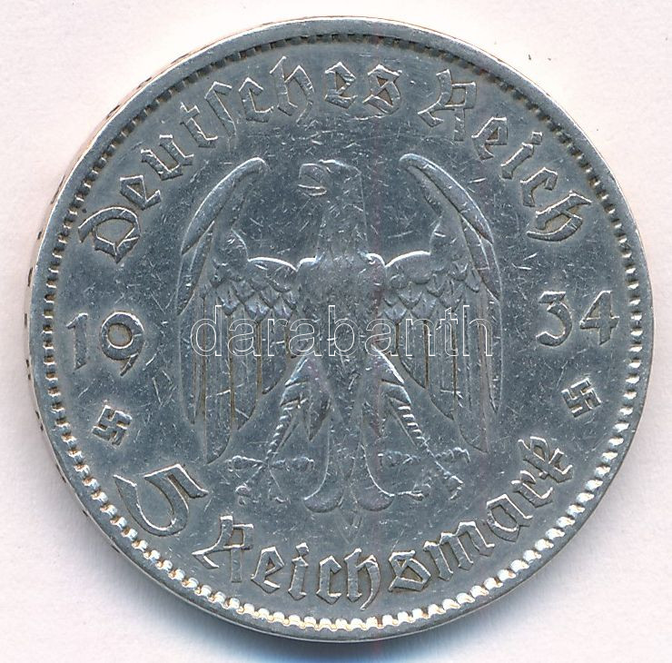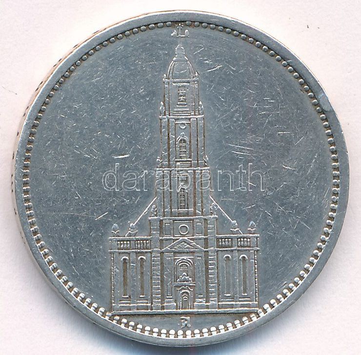 Német Harmadik Birodalom 1934A 5M Ag "Garnisonkirche" T:VF k... https://www.darabanth.com/en/457-Online-auction/457.0/Numismatics/Worldwide-silver-and-metal-coins~16/Nemet-Harmadik-Birodalom-1934A-5M-Ag-Garnisonkirche-TVF-kis-ph-karc-German-Third-Reich-1934A-5~II3018667