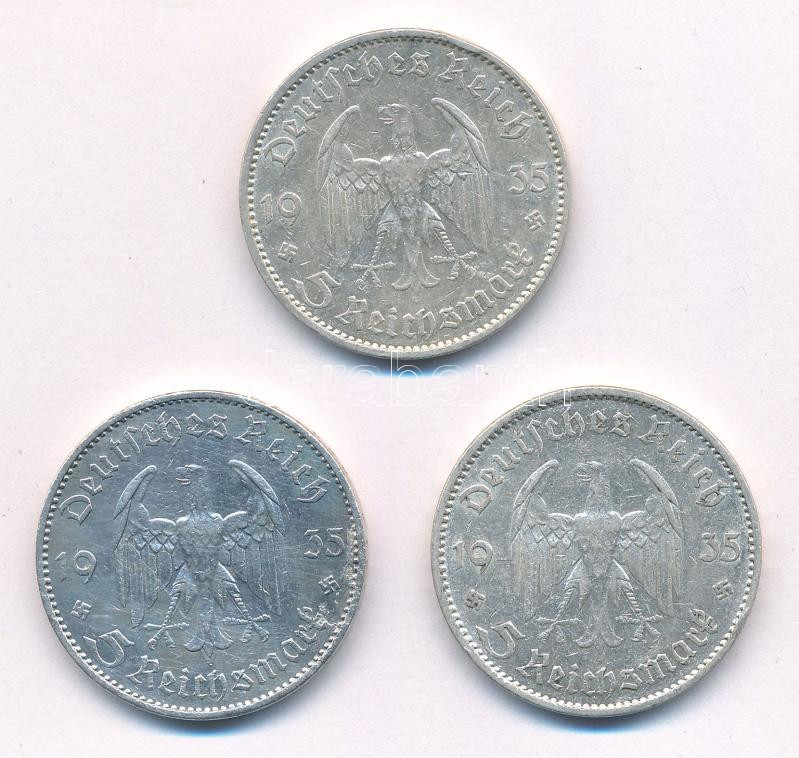 Description: Német Harmadik Birodalom 1935A 5M Ag "Garnisonkirche" (3x) T:2 ph. German Third Reich 1935A 5 Reichsmark Ag "Garnisonkirche" (3x) C:XF edge error Krause KM#83