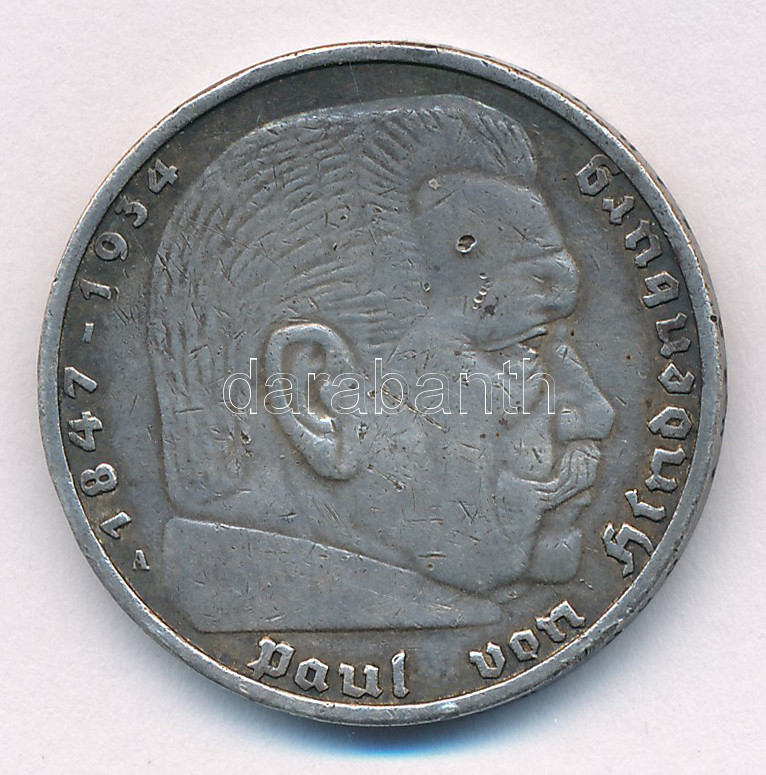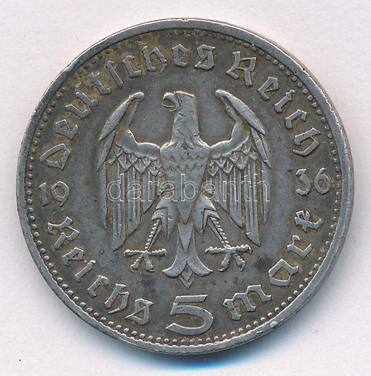 Német Harmadik Birodalom 1936A 5M Ag "Hindenburg" T:VF patin... https://www.darabanth.com/en/457-Online-auction/457.0/Numismatics/Worldwide-silver-and-metal-coins~16/Nemet-Harmadik-Birodalom-1936A-5M-Ag-Hindenburg-TVF-patina-ph-u-German-Third-Reich-1936A-5-~II2856414