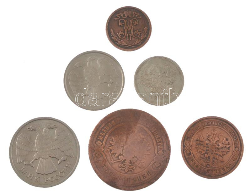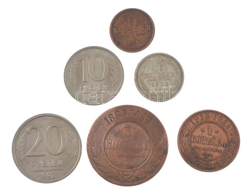 Oroszország 1883. 3k Cu + 1898. 1/2k Cu + 1908. 10k Ag + 1913. 1k Cu + 1992. 10R Cu-Ni + 20R Cu-Ni T:XF-F