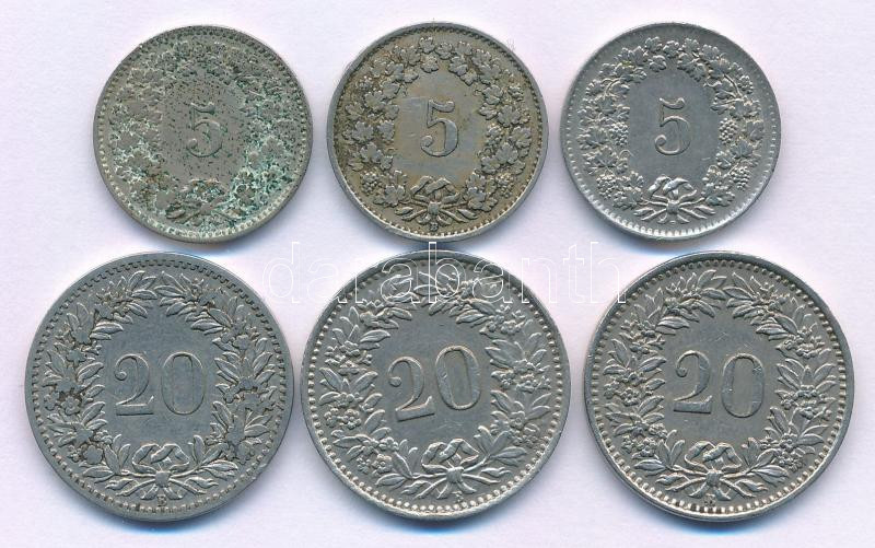 Svájc 1889-1962. 5R Cu-Ni (3xklf) + 1891. 20R Ni + 1955-1960. 20R Cu-Ni (2xklf) T:XF-F patina