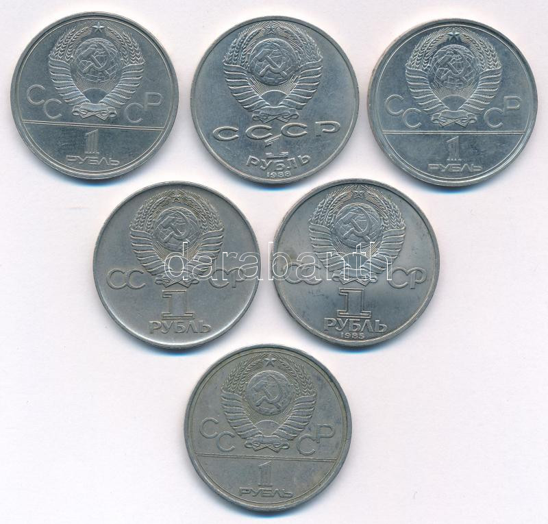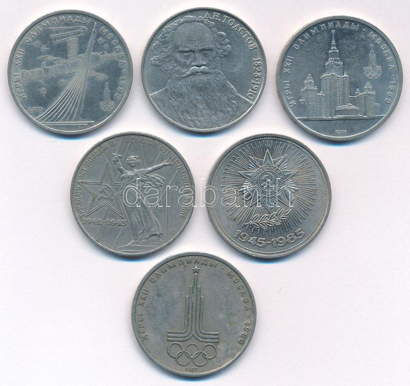 Szovjetunió 1975-1988. 1R Cu-Ni (6xklf) forgalmi emlékpénz, benne "Szputnyik-Szojuz", "Lev Tolsztoj", "Lomonoszov Egyetem", "A győzelem 30. évfordulója", "A győzelem 40. évfordulója", "Moszkvai Olimpia" T:AU-VF Soviet Union 1975-1988. 1 Ruble Cu-Ni (6xklf) circulating commemorative coins, within "Sputnik-Soyuz", "Lev Tolstoy", "Lomonosov University", "30th anniversary of the victory", "40th anniversary of the victory", "Moscow Olympics" C:AU-VF