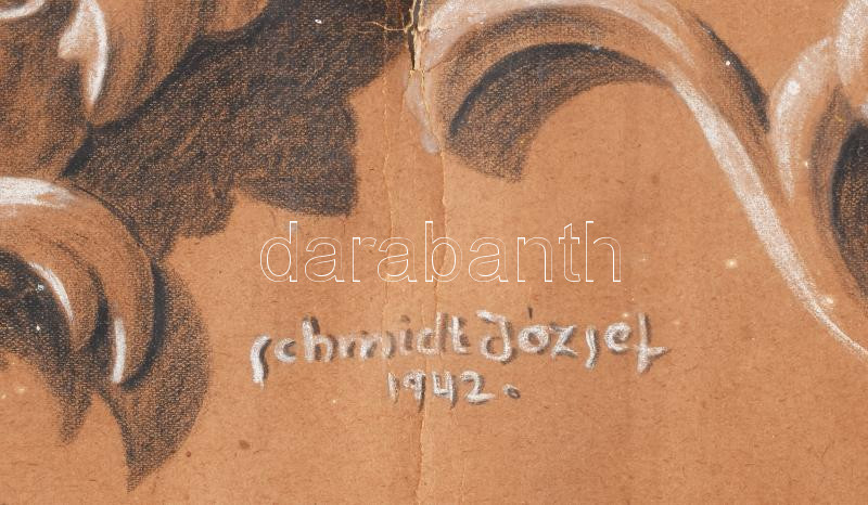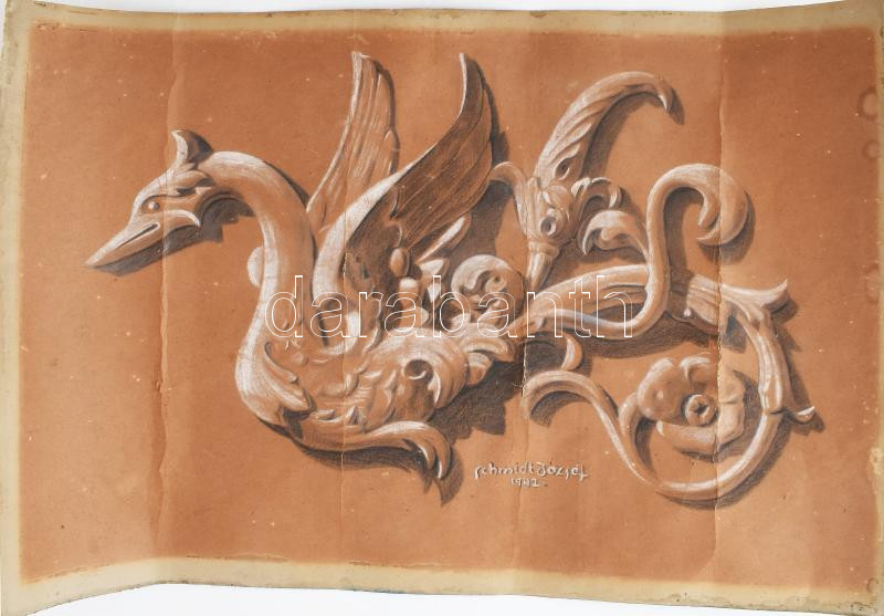 1942 "Hattyú", iparművész-dísz terve, vegyes technika, papír, jelzett (Schmidt József 1942), feltekerve, sérült, kis lyukkal, a feltekerés mentén törésnyomokkal, foltos, 40x61 cm