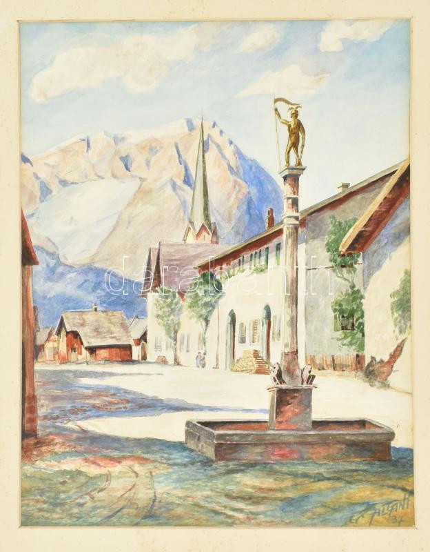 Altani jelzéssel: Partenkirchen - Florianplatz Alpesi városka, 1937. Akvarell, papír. paszpartuban. 40x31,5 cm