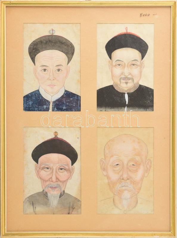 Jelzés nélkül: Ázsiai férfi arcképek, össz. 4 db egy keretben. Vegyes technika, papír, foltos, részben kissé sérült. Üvegezett, kissé sérült fakeretben, 15x10 (x4) cm