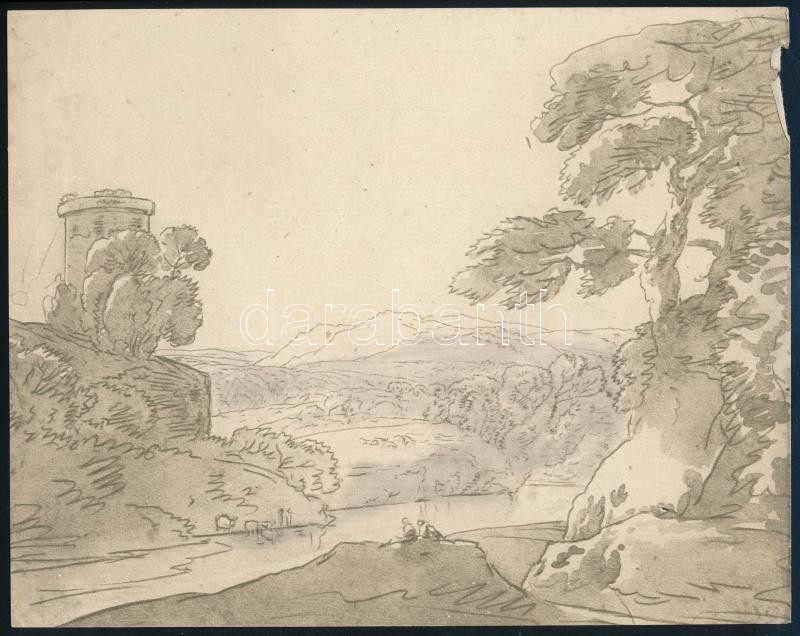 Jelzés nélkül, XIX. sz. festő: Hegyvidéki táj alakokkal. Tus, papír, l...