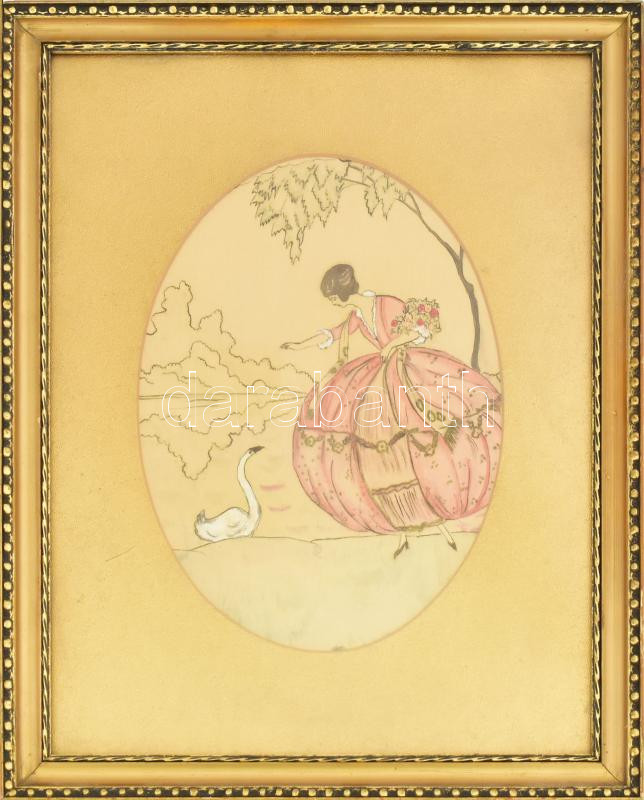 https://www.darabanth.com/en/457-Online-auction/457.0/Paintings-and-graphics/Paintings-and-graphics-quot-signedquot-or-quot-without-signquot-~500003/Jelzes-nelkul-XX-sz-eleje-Dama-hattyuval-Akvarell-tus-selyem-Uvegezett-dekorativ-fak~II3015941