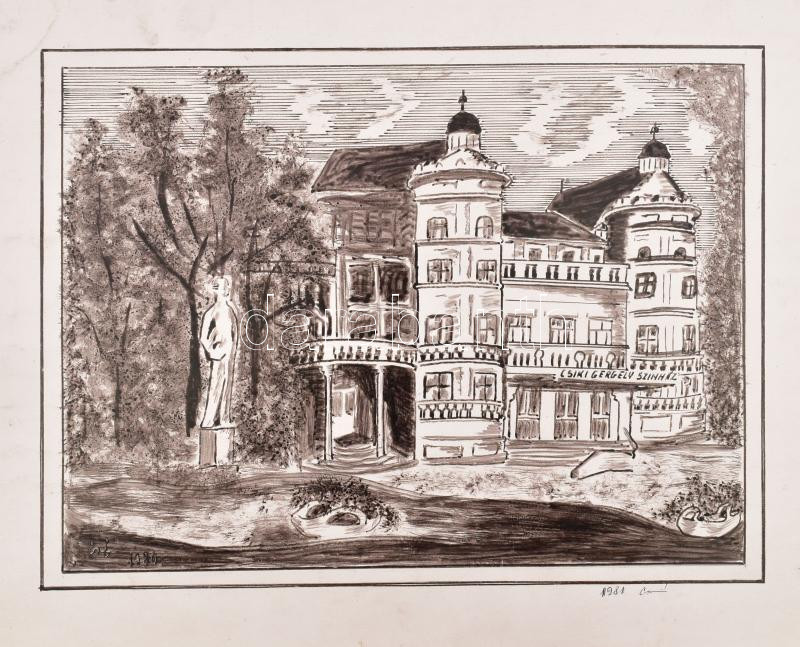 Olvashatatlan jelzéssel, 2 db mű: Hölgyek holdfényben és Csiky Gergely Színház Kaposvár. Tus, karton, 26x33 és 30x21 cm