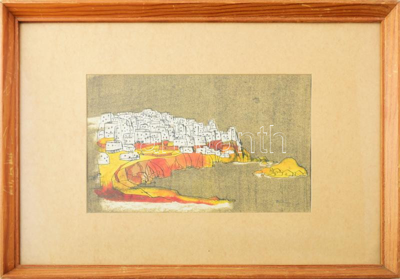 Olvashatatlan jelzéssel: Vízparti városka. Vegyes technika, papír. Üve...