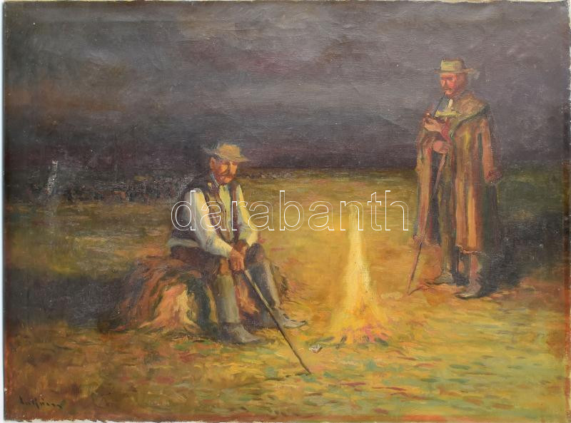Olvashatatlan jelzéssel, XX. sz. első fele: Pásztortűznél. Olaj, vászo...
