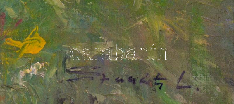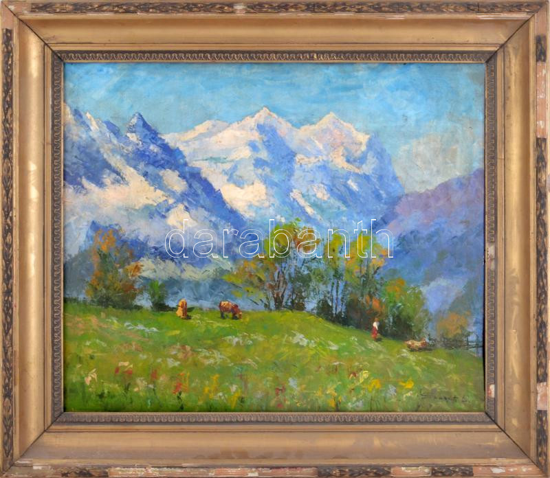Olvashatatlan jelzéssel, feltehetően a XX. sz. közepén működött magyar festő: Hegyvidéki táj pásztorral és tehenekkel. Olaj, vászon. Dekoratív, sérült fakeretben, 50×60 cm
