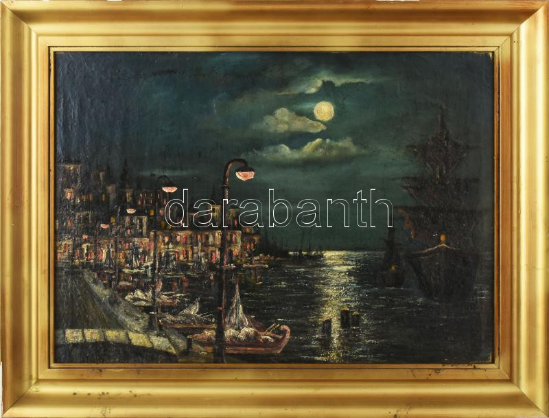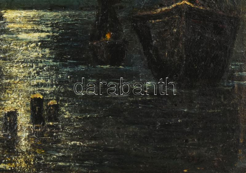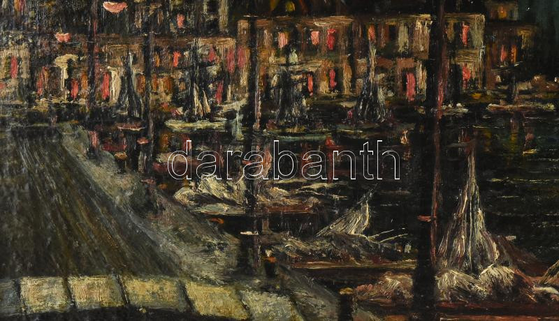 Olvashatatlan jelzéssel (jobbra lent): Kikötő. Olaj, farost, felületi töréshálóval. Sérült fakeretben. 45x65 cm