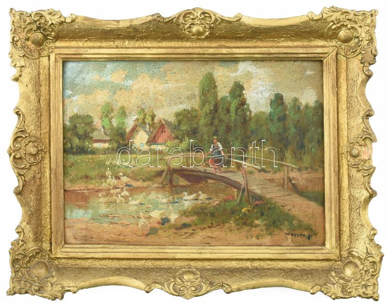 Pataky jelzéssel: Libapásztorlány. Olaj, karton. 25x35 cm. Dekoratív, kissé sérült fakeretben.