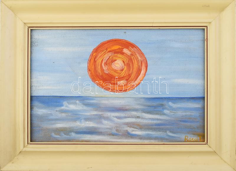 Rossi T jelzéssel: Vöröslő napkorong. Olaj, farost. Fakeretben. 26,5x40 cm