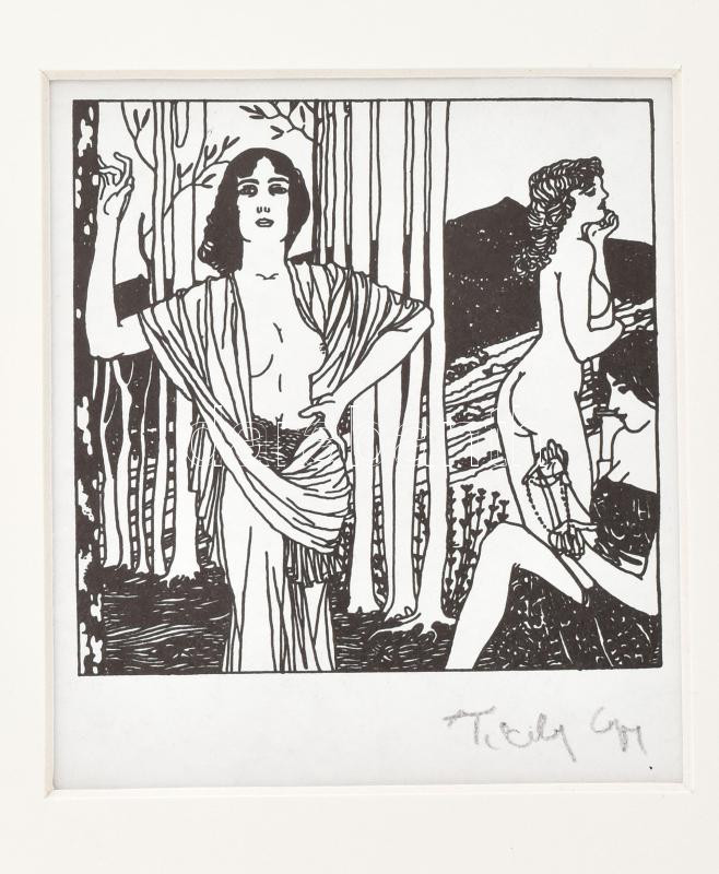 Tichy Gyula (1879-1920): Nő k erdőben, nyomat, paszpartuban, utólagos ...