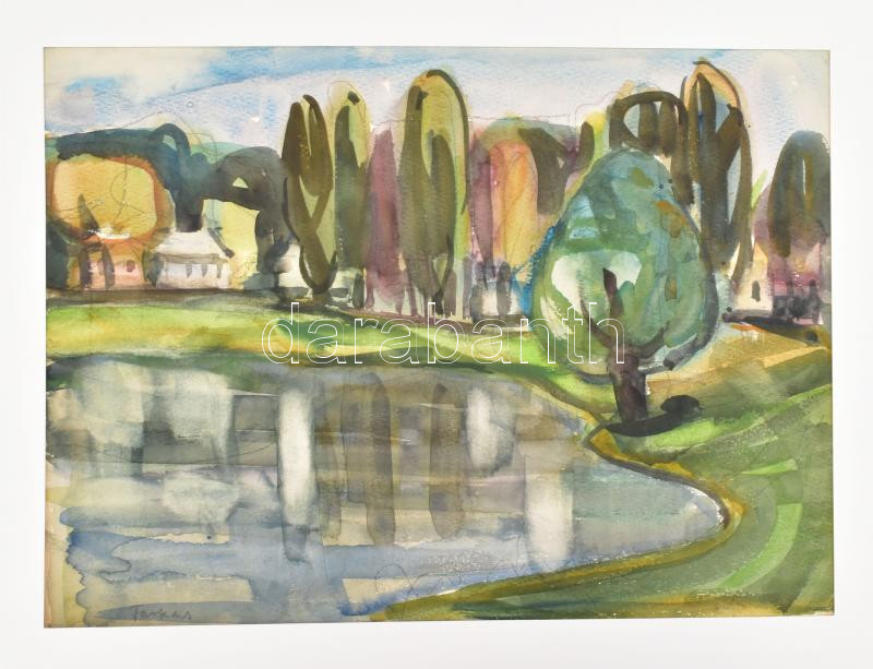 Farkas Lajos (1919-1998): Vízparti táj. Akvarell, papír, jelezve balra...
