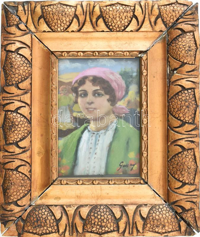 Description: Garay jelzéssel: Lány a vásárban, 1922 körül. Olaj, rétegelt falemez, jelezve jobbra lent. Hátoldalán 1922.XII.22 és 7000 korona felirattal. Üvegezett, dekoratív, sérült fakeretben. 16x11,5 cm