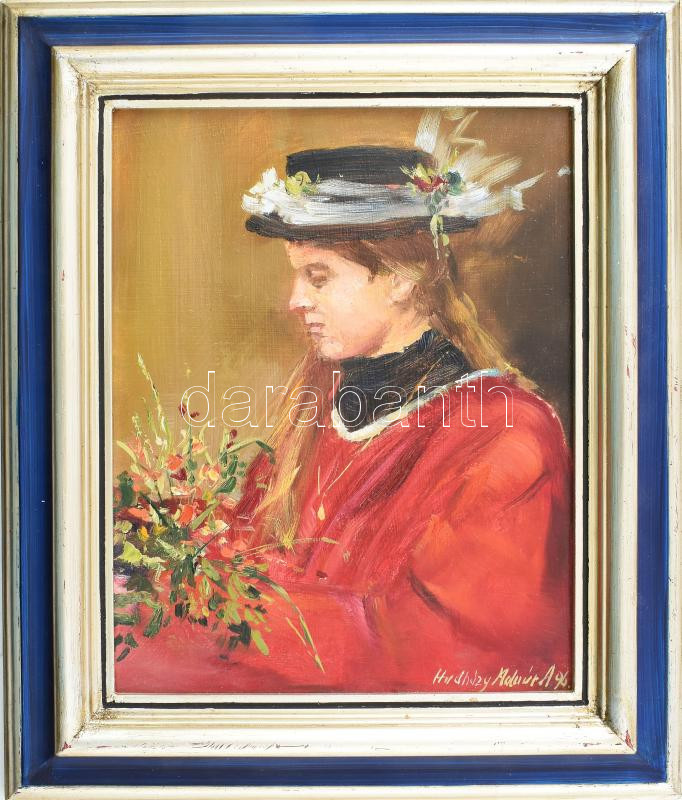 Hadházy Molnár Attila (1962-): Lány virágokkal. Olaj, farost, jelezve ...
