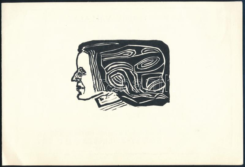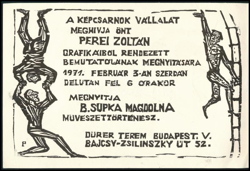 Description: Perei Zoltán (1913-1992), 3 oldalas kép kihajtható meghívón: Meghívó Képcsarnok Dürer termébe rendezett kiállítására, 1971. Fametszet, papír. Jelzett. 11x16,5, 14x22 és 6,5x9,5 cm.