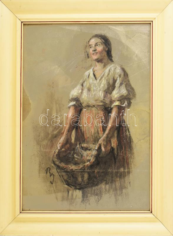 Révész Imre (1859-1945): Parasztasszony kosárral. Vegyes technika, pap...