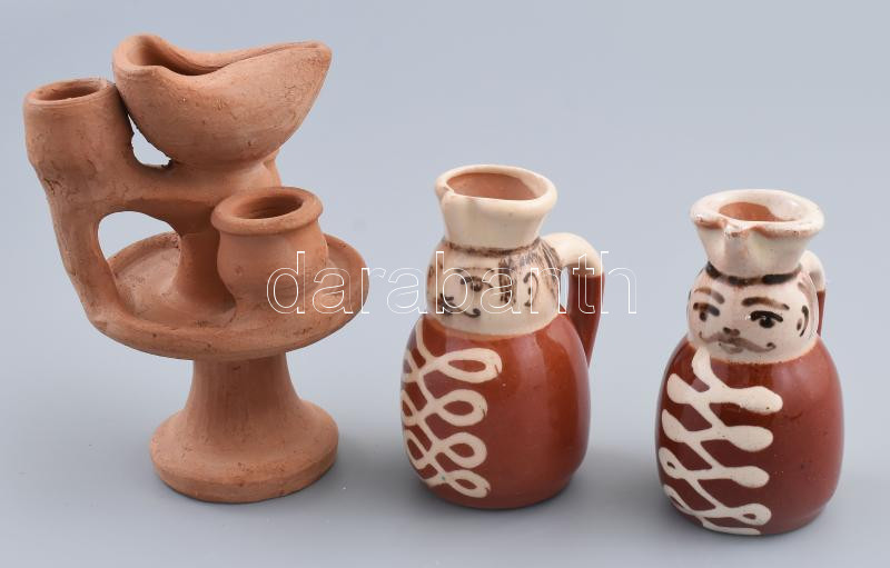 3 db retro kerámia iparművész tárgy, 2 kis miskakancsó, gyertyatartó, kopással, m: 9,5-13,5 cm