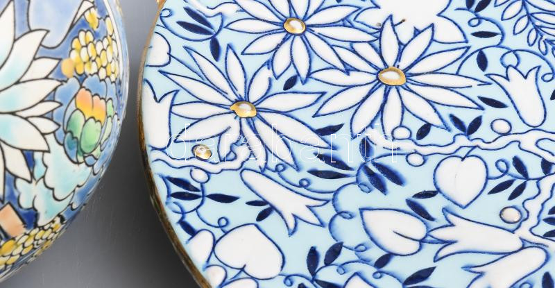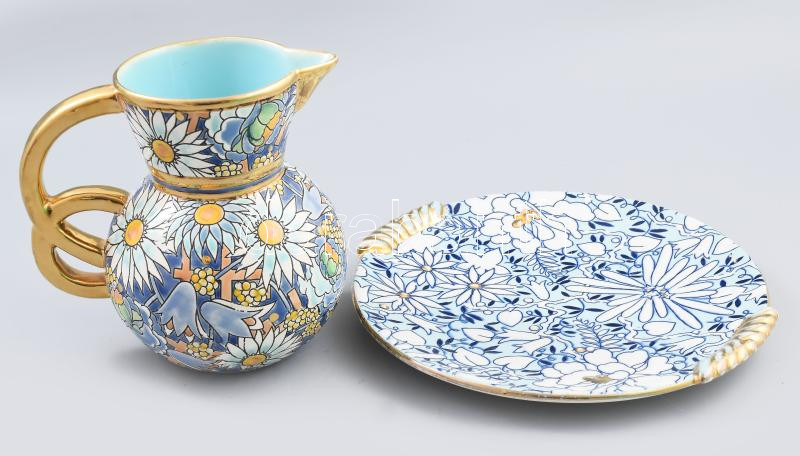 Description: Boch & Fréres Virágos art deco kancsó és tál. La Louviere, Belgium cca 1920. Dekorterv: Raymond Chevallier. Kézzel festett, a tál plasztikus, aranyozott, jelzett, kis kopással. Kancsó m: 16 cm, tányér d: 22 cm