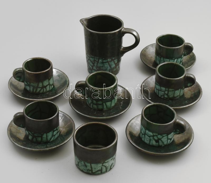 Iparművészeti kerámia 6 személyes mokkás készlet, repesztett mintát idéző, enyhén irizáló mázzal, nagy kiöntő nélkül, jelzés nélkül, kis kopottsággal