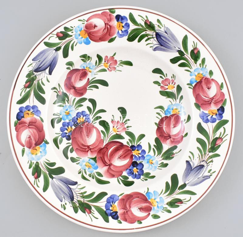 Kézzel festett virágmintás dísztál, jelzéssel, hibátlan, d: 31 cm