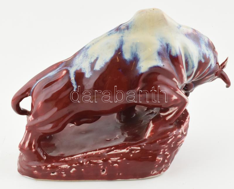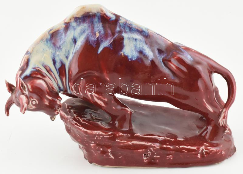 Nagyméretű kerámia bika, festett, mázas, jelzett, lepattanással a szar...