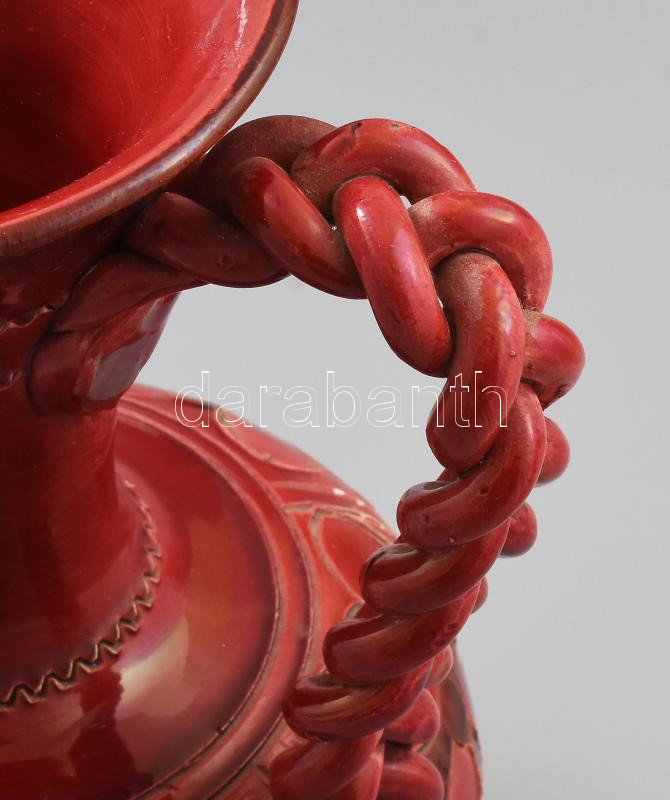Népies, fonott fogójú mázas kerámia váza. Minimális lepattanással 25 cm