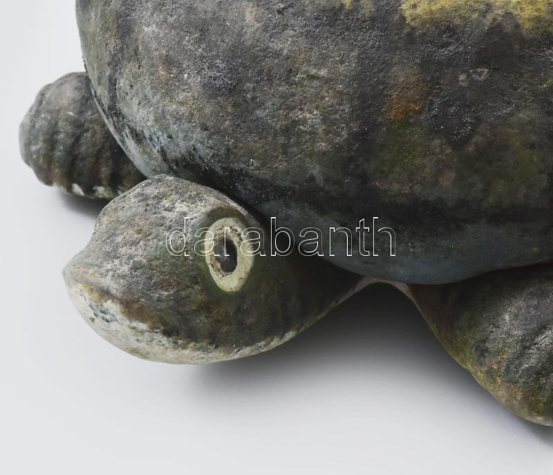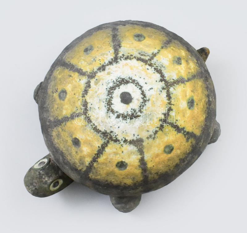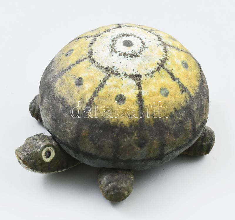 Simó Ágoston (1925-2011): Teknős. Magas hőfokon égetett, rézoxiddal színezett, samottos agyag. Alján jelzett:. Hibátlan, 18x12x9,5 cm /// "1943-49: Magyar Iparművészeti Főiskola kerámia szak, mestere: Borsos Miklós, Gádor István, Molnár Elek és Ohmann Béla volt. 1957: Iparművészeti Pályázat I. és II. díj; 1960: Iparművészeti Pályázat I. és III. díj; 1985: Magyar Alkotóművészek Országos Egyesülete-díj; 2002: Ferenczy Noémi-díj. 1950-től a Gránit Kőedény és Porcelángyár, 1952-54 között pedig a Kerámia Iparművészeti Szövetkezet tervezőjeként dolgozott. 1954-től szabadfoglalkozású művész. A Siklósi Kerámia szimpóziumon 1972-ben és 1976-ban vett részt. Tevékenységi köre a kerámia teljes területére kiterjed, ezen belül jelentős szerepet kaptak a figurális plasztikák, a murális feladatok, továbbá a cserépkályhák."