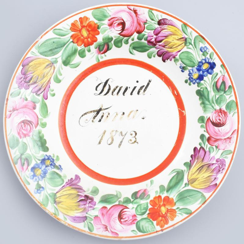 1873 Apátfalva, Dávid Anna feliratú dísztál. Jelzett, kis sérülésekkel, d: 22,5 cm