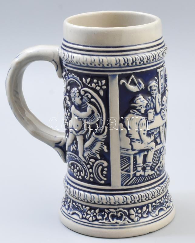 Gerz vadászmintás söröskorsó, steinzeug, vadászjelenettel és vadászó puttós jelenettel díszített, jelzéssel, hibátlan, m: 17 cm