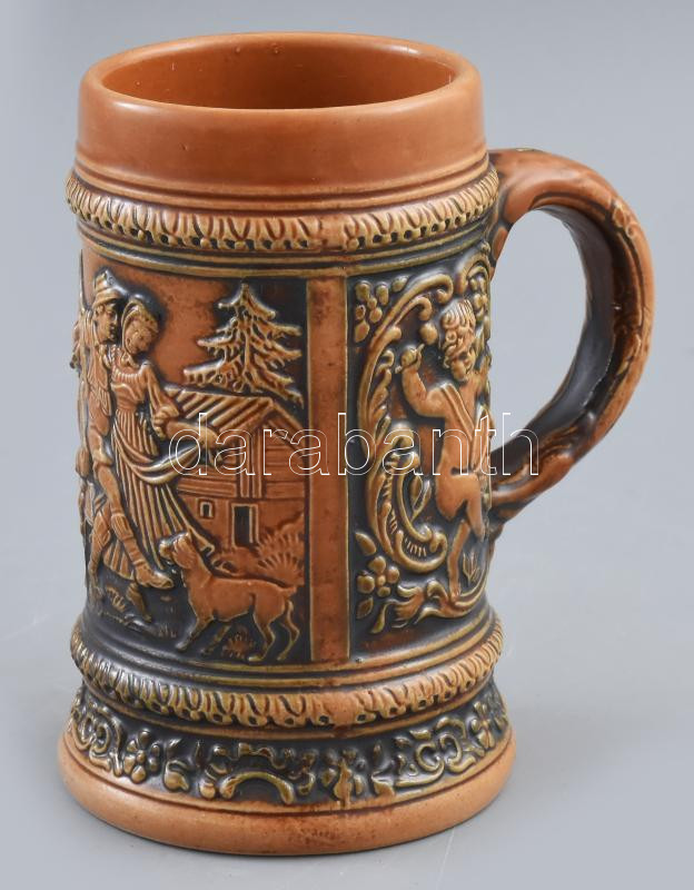 Gerzit gyűjtői söröskorsó, a gyár saját antik mintájával, körben figurális jelenetekkel díszítve, áttetsző barna mázas, jelzett, hibátlan, m: 13 cm