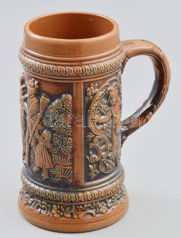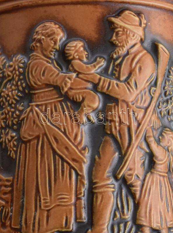 Description: Gerzitl vadászkorsó, körben matt csokoládémázzal bevont vadászjelenetekkel díszítve, ornamentikus díszítéssel kialakított füllel, jelzéssel, hibátlan, m: 16,5 cm