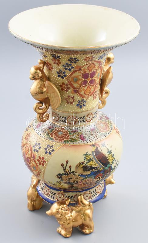 Description: Kínai nagyváza. Plasztikus állatalakokkal és zománcfestett mintákkal gazdagon díszített, jelzett, repedt mázzal és szájánál kis repedésvonallal, m: 35,5 cm